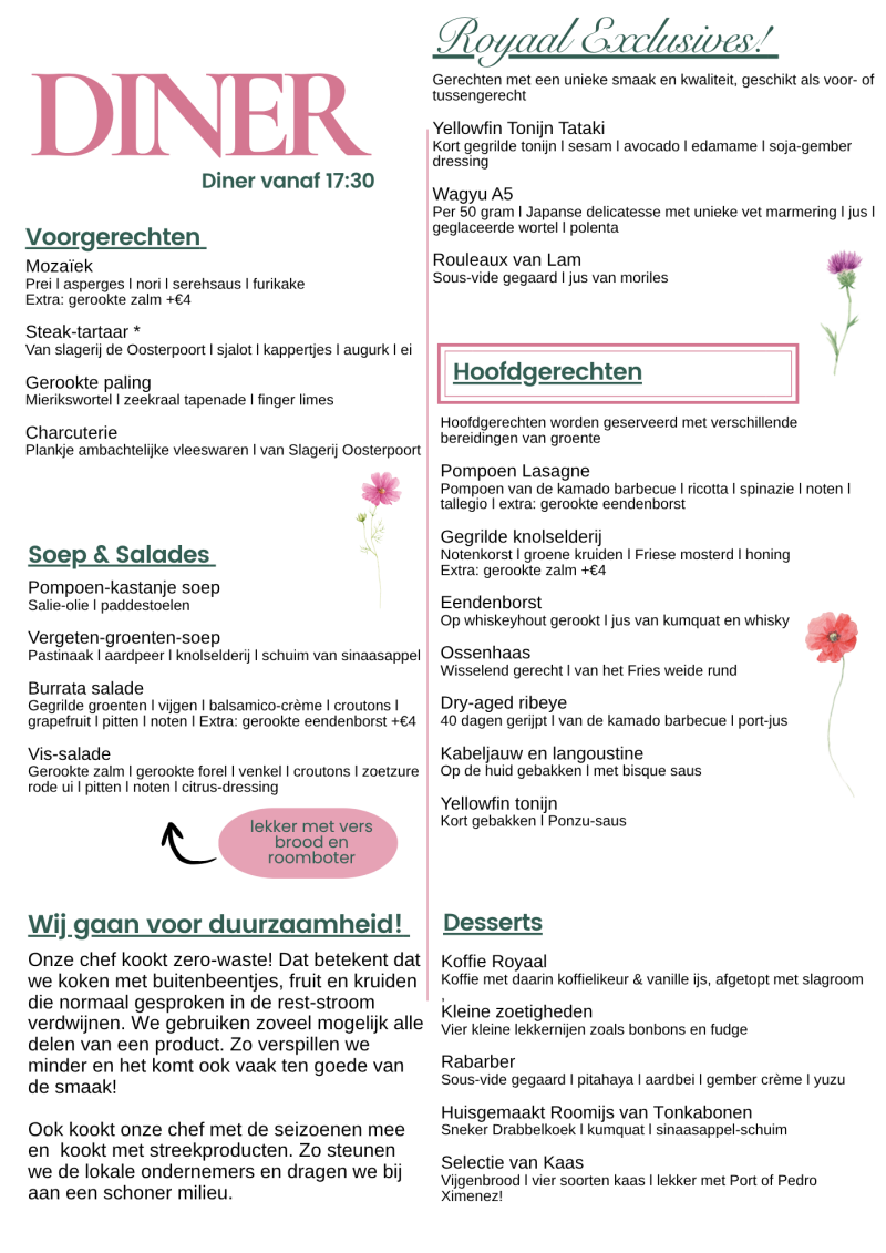 Menukaart; ontbijt, lunch en nu ook diner!